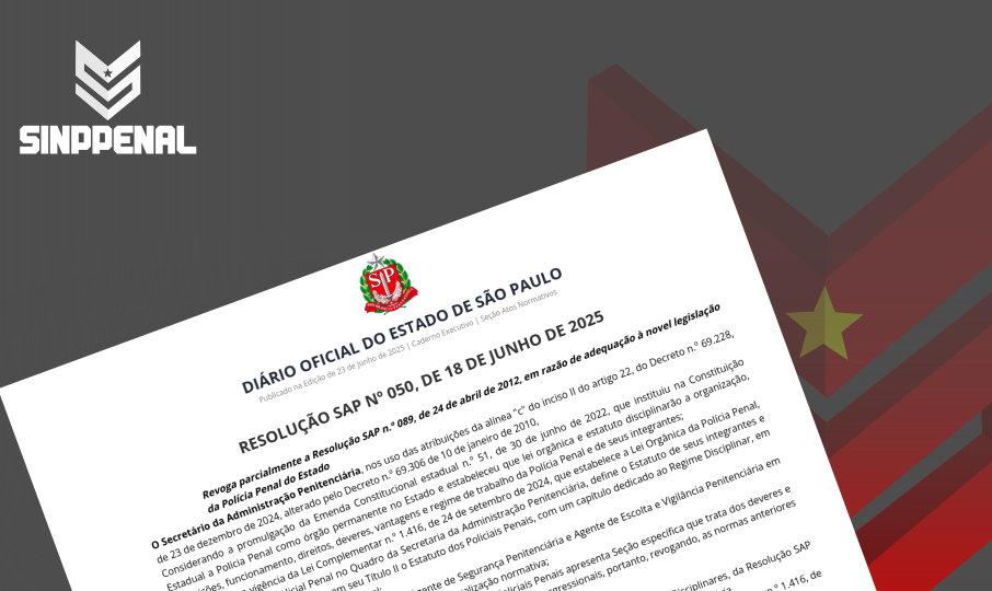 Resolução da Secretaria de Administração Penitenciária nº 050, de 18 de junho de 2025, revoga partes da Resolução SAP nº 089/2012, que se adequa à nova legislação em vigor da Polícia Penal do Estado de São Paulo. Especificamente, foram revogadas as seções VII e VIII que dizem respeito às transgressões disciplinares dos policiais penais. A seção VII trata dos direitos e deveres, enquanto que a seção VIII diz respeito às transgressões disciplinares previstas no ato de 2012.