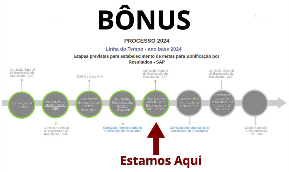 Cabe salientar que as fases subsequentes da Bonificação por Resultados dependem da Comissão Intersetorial de Bonificação por Resultados e que essa mesma comissão no ano passado determinou a alteração das metas para a SAP, ocasionando grande atraso no pagamento da Bonificação referente ao ano de 2023 o que ocasionou que a mesma só fosse paga em janeiro deste ano.