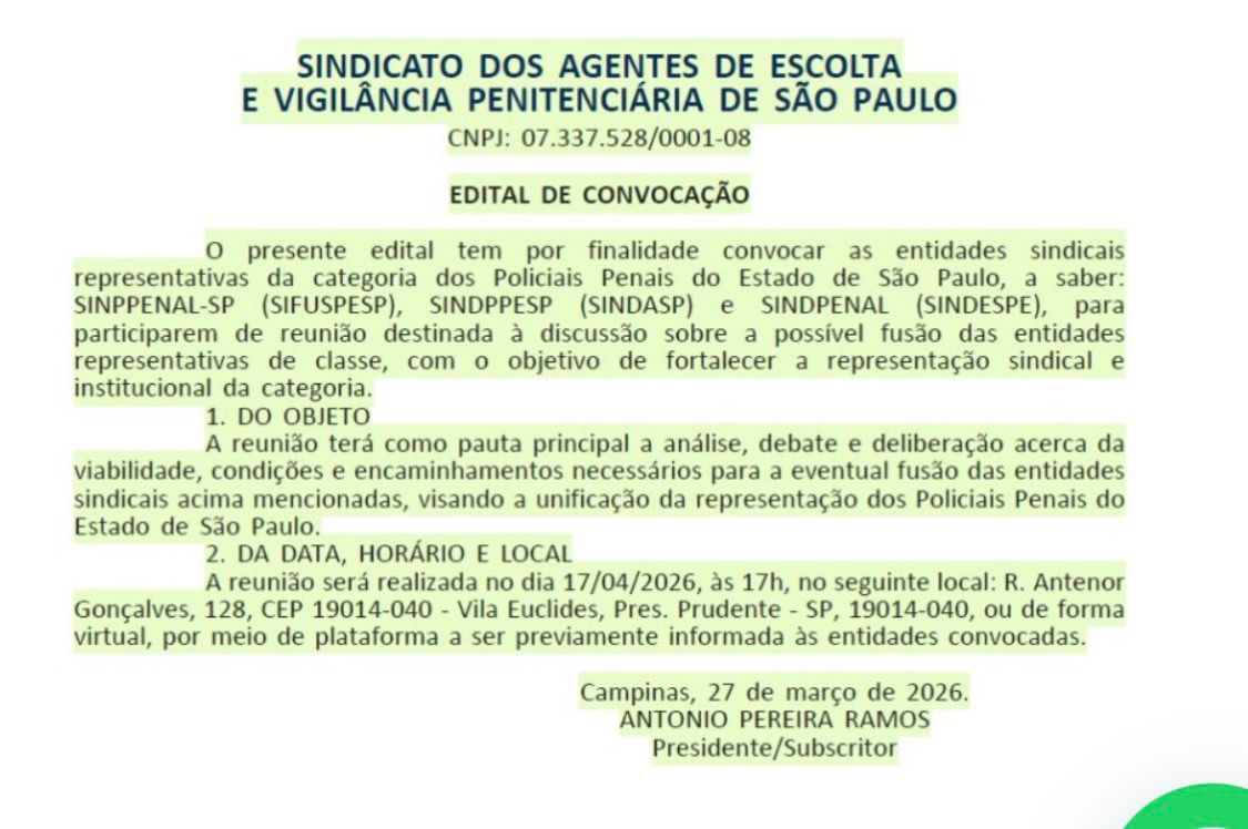 Com a fusão do SINPPENAL, SINDPPESP e SINDPENAL será criado o maior sindicato de Polícias Penais do Brasil, para representar a maior Polícia Penal do país.