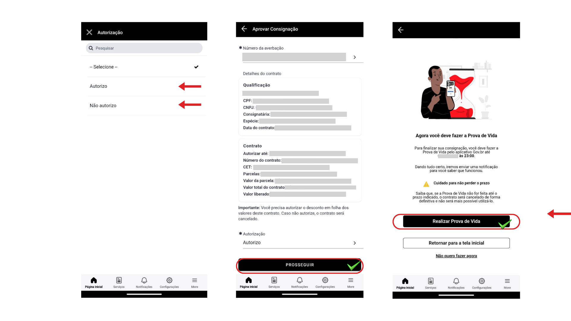 Importante: A Prova de Vida deverá ser realizada até as 23:00 horas do mesmo dia, ou o contrato será cancelado por razões de segurança.